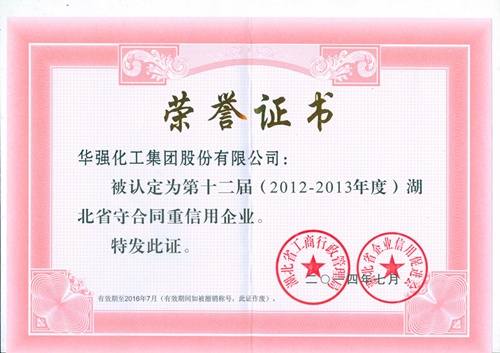 近日,从湖北省工商行政管理局获悉,我公司被省工商行政管理局和企业信用促进会认定为第12届(2012-2013年度)“湖北省守合同重信用企业”。在整个制造行业不景气的环境下,公司坚持诚信经营,已连续三届获此殊荣。